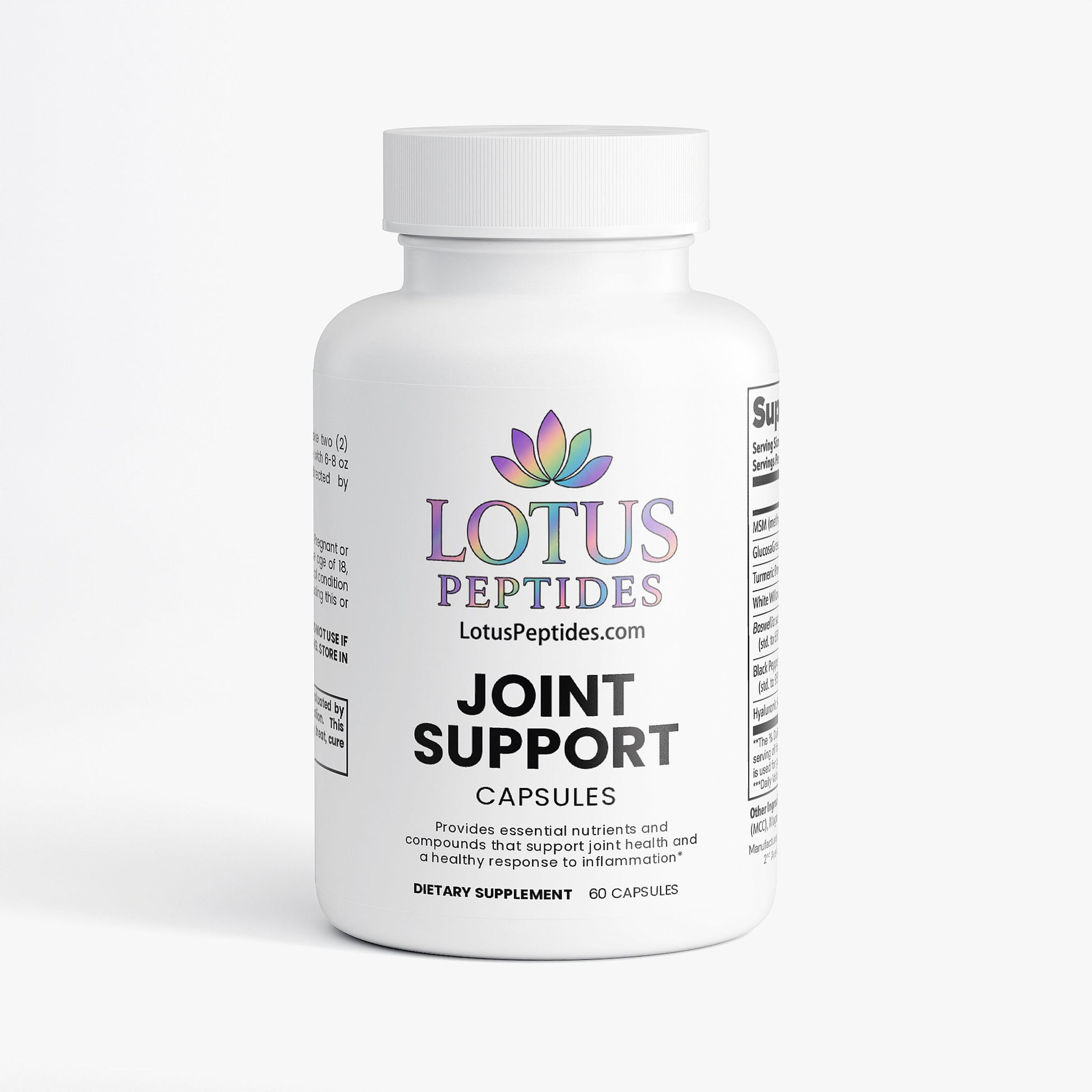 This joint support supplement provides essential nutrients and compounds that support joint health. It features a comprehensive blend of ingredients such as MSM, GlucosaGreen® vegetal glucosamine HCl, Turmeric Powder, and Boswellia serrata Extract, designed to promote joint flexibility, reduce discomfort, and support overall joint function. Ideal for daily consumption, this supplement aims to enhance your joint health through its potent, natural ingredients, without relying on artificial additives.*