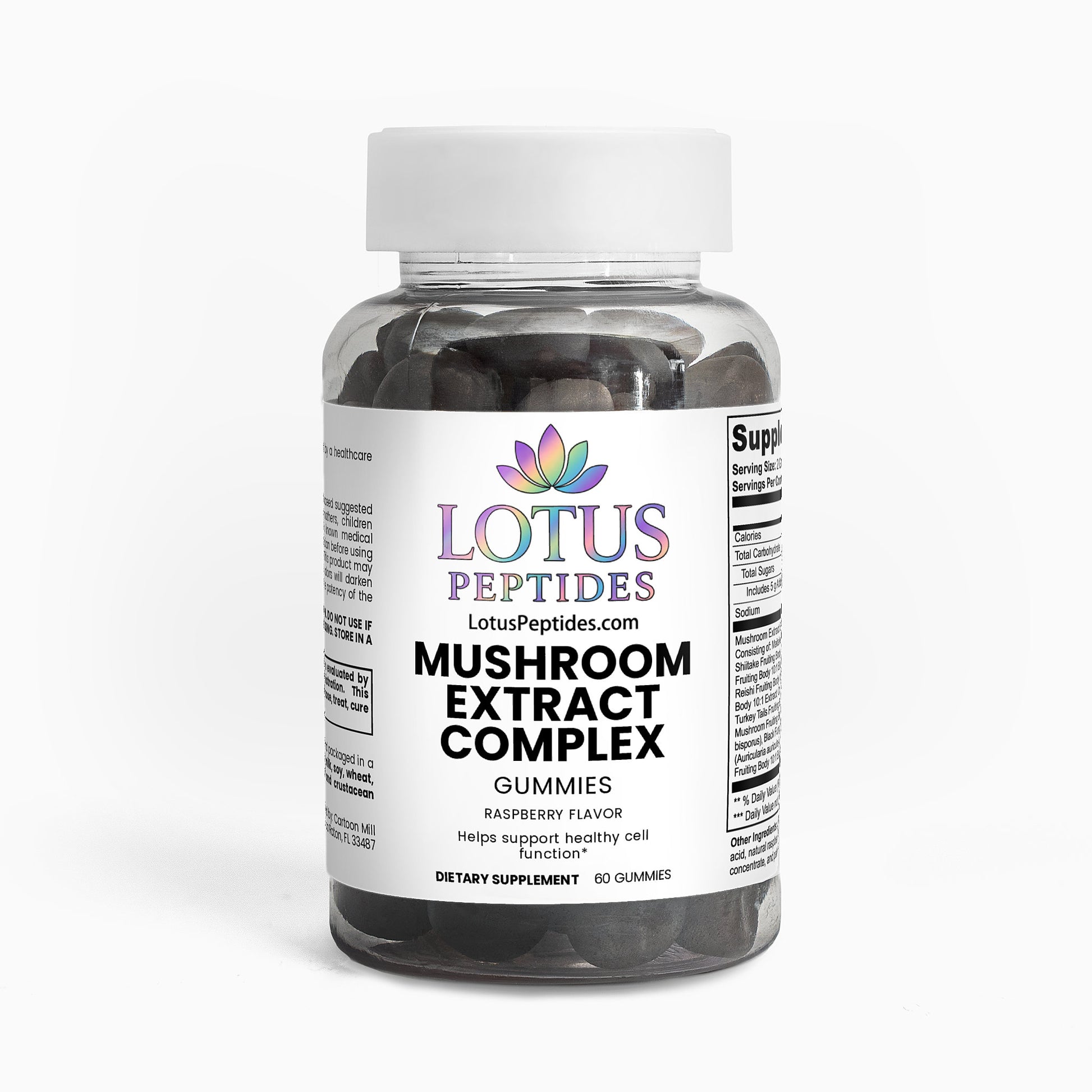 Ingredients: Mushroom extract (Maitake Fruiting Body 10:1 Extract, Shiitake Fruiting Body 10: 1 Extract, Lion’s Mane Fruiting Body 10:1 Extract, Reishi Fruiting Body 10:1 Extract, Cordyceps Fruiting Body 10:1 Extract, Chaga Fruiting Body 10:1 Extract, Turkey Tails Fruiting Body 10:1 Extract, White Button Mushroom Fruiting Body 10:1 Extract, Black Fungus Fruiting Body 10:1 Extract, Royal Sun Mushroom Fruiting Body 10:1 Extract), glucose syrup, sugar, dextrose, pectin, citric acid, natural raspberry flavor, sodium citrate, purple carrot juice concentrate, palm oil (contains carnauba wax).